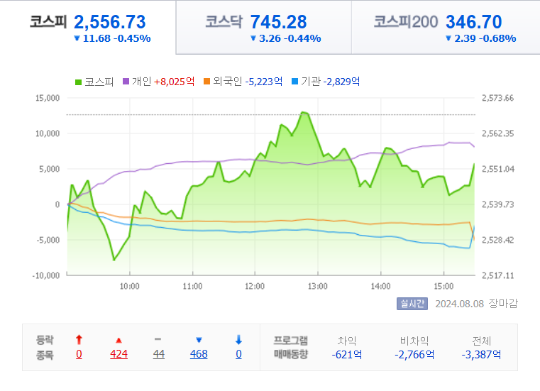 코스피 지수는 전날보다 11.68(0.45%) 하락한 2556.73으로 장을 마쳤습니다.