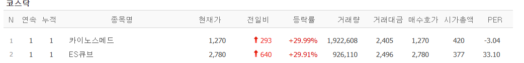 오늘도 상한가 종목은 2종목인데 거래대금도 적고 시총도 낮은 종목이 상한가 마감함.