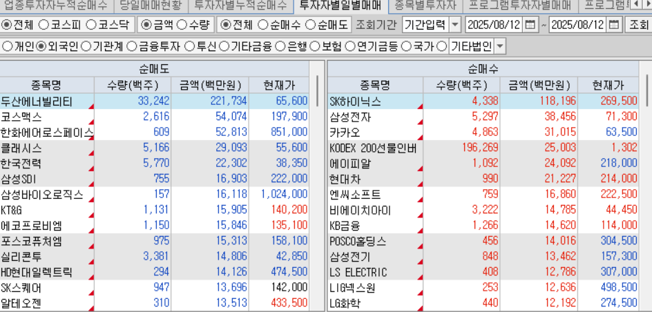 오늘 외국인과 기관순매수는 sk하이닉스를 양매수 하며 상승을 보였고