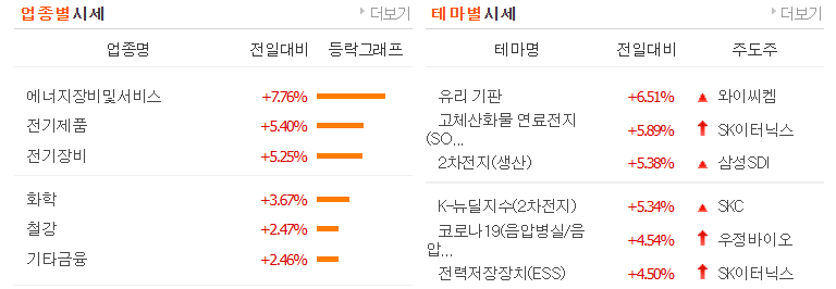 반면 신재생에너지 관련테마가 크게 상승을 했고 금융주가 크게 하락을 했습니다.