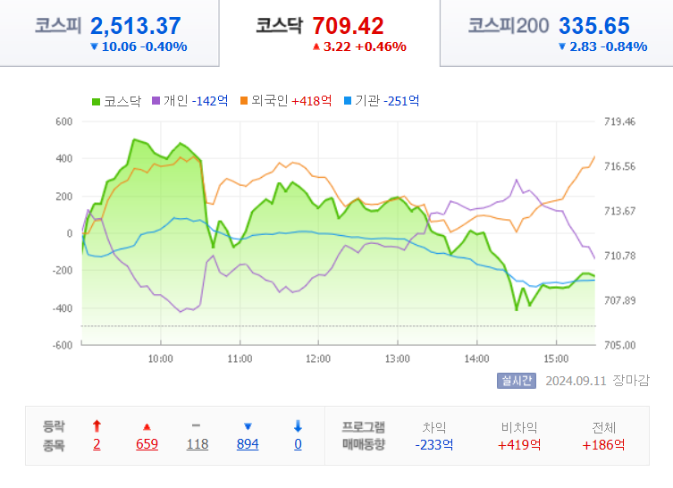 외국인이 418억 원 순매수를 했고 기관과 개인이 각각 251억 원, 142억 원 순매도를 했습니다.
