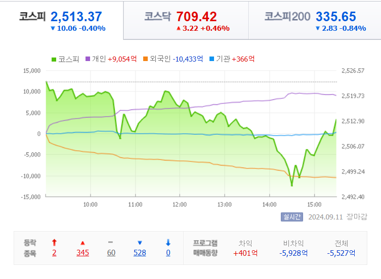 코스피 지수는 저날 보다 10.06(0.40%) 하락한 2513.37로 장을 마쳤습니다.