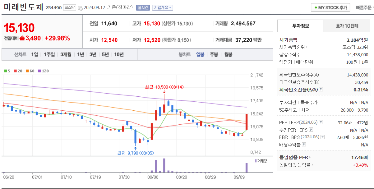 반도체(중소형) - 미래반도체(상한가), 와이씨(21.32%), MDS테크(16.84%), 오킨스전자(14.09%)