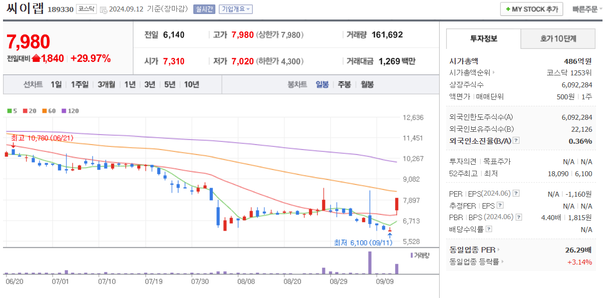 개별이슈 - 씨이랩(상한가) - 18억 규모 계약 수주 이슈