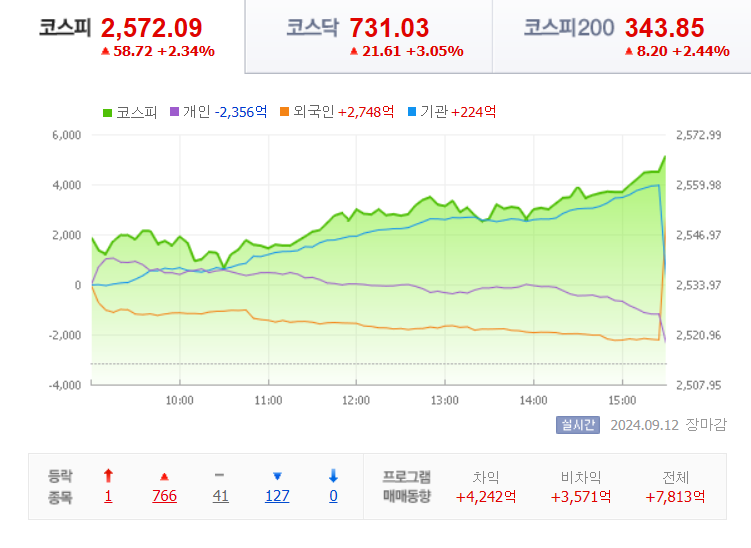마감을 했습니다. 코스피 지수는 전날보다 58.72(2.34%) 상승한 2572.09로 장을 마쳤습니다.