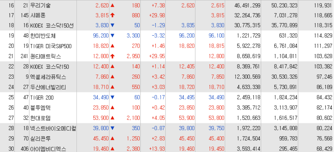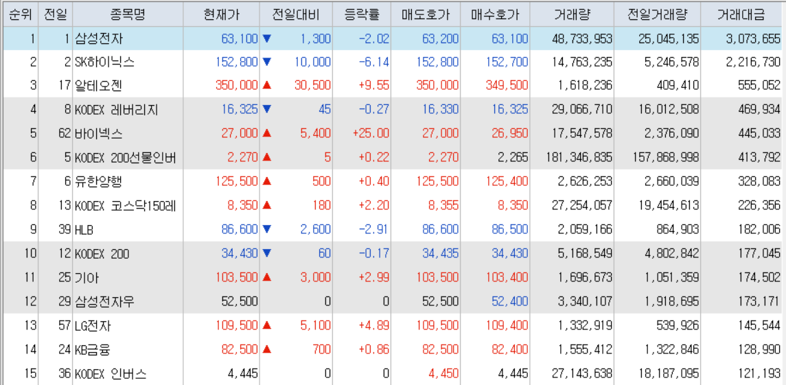 오늘 거래대금 상위종목에서 반도체 대장인 두종목이 거래대금 5조가 넘게 나오면서 크게 하락을 했고