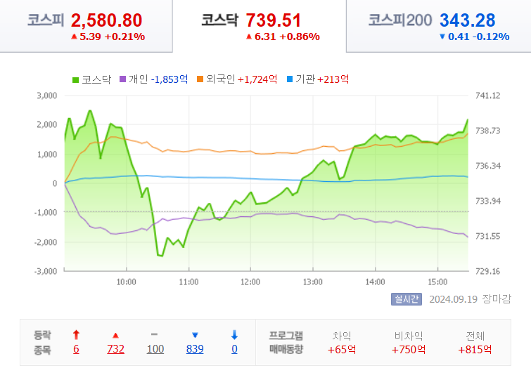 마감했습니다. 코스닥 지수는 전 거래일 보다 6.31(0.86%) 상승한 739.51로 장을 마쳤습니다.