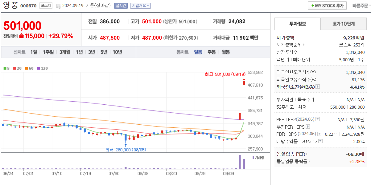 오늘 상한가 이유로는 전 거래일과 같은 이슈로 오늘 갭상승 상한가 마감을 했습니다. 고려아연 경영권 분쟁