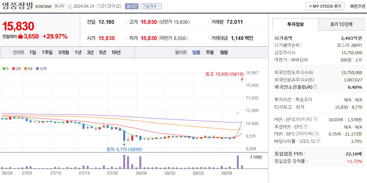 마감까지 했습니다. 상한가 이유로는 같은 이슈인 고려아연 경영권 분쟁이슈로 상한가 마감 했습니다.