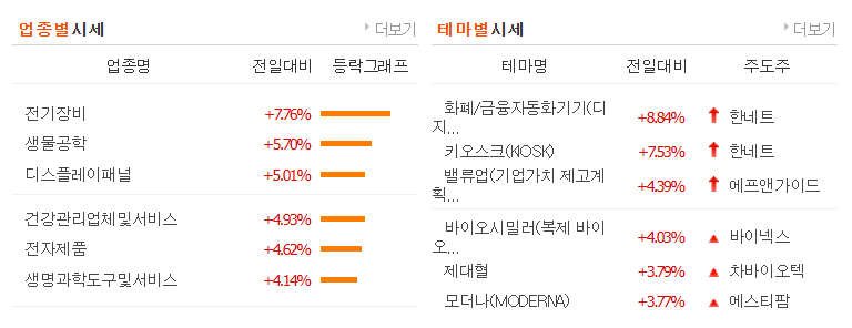 금리인하이슈에 따른 제약 바이오 섹터가 크게 상승을 주도했고 조선, 자동차, 전력 관련주가 상승을 했네요.