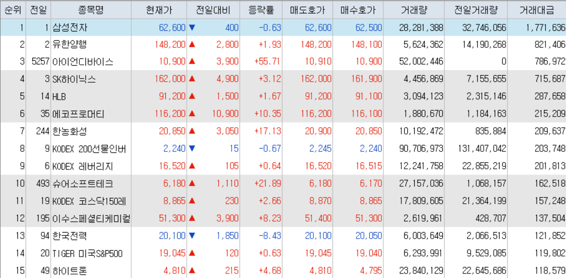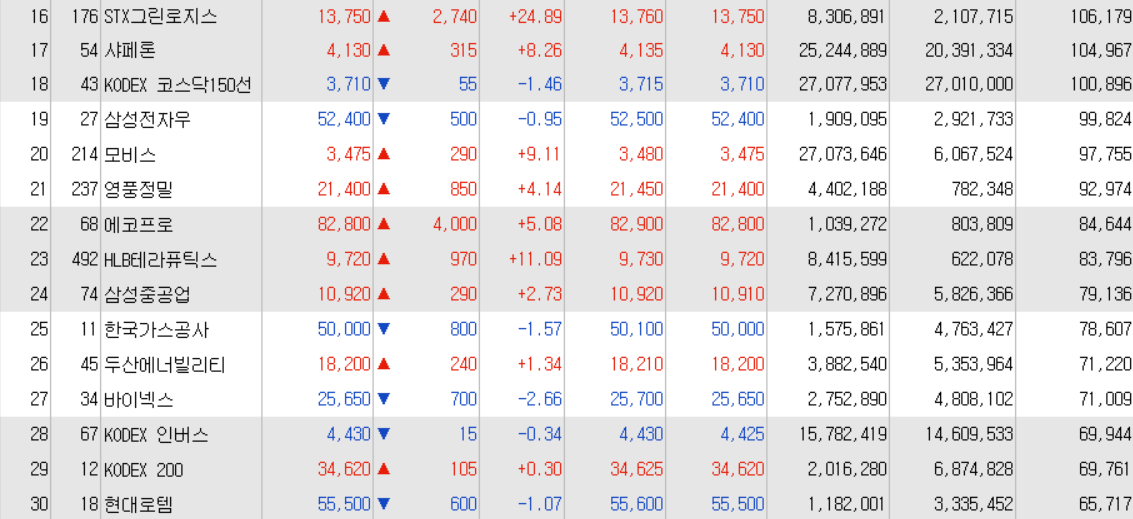 오늘 거래대금 상위종목에서는 신규상장주인 아이언디바이스 종목이 크게 상승출발 했지만 상승분을 많이