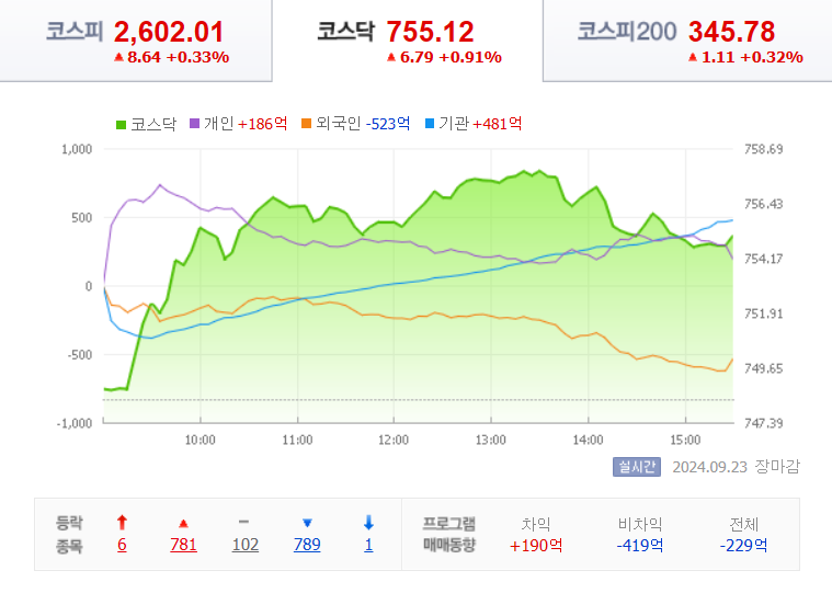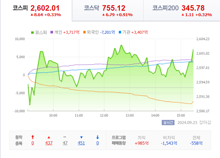 했습니다. 코스피 지수는 전 거래일 보다 8.64(0.33%) 상승한 2602.01로 장을 마쳤습니다.