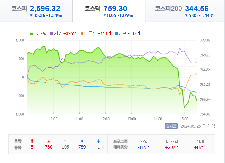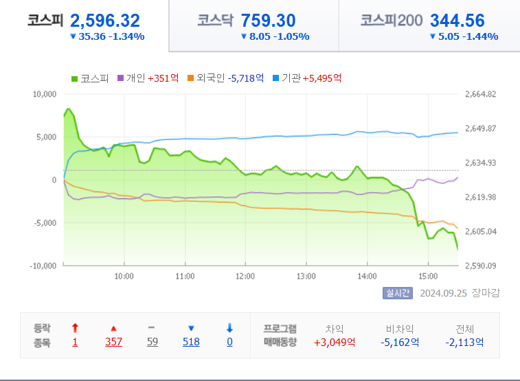 늘어나면서 결국 장후반 크게 하락 마감했습니다. 코스피 지수는 전날보다 35.36(1.34%) 하락한 2596.32로