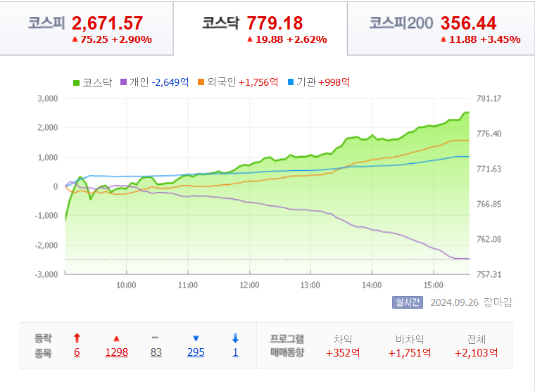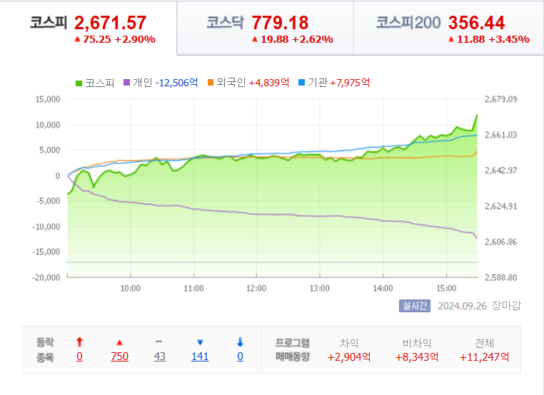 큰 폭으로 상승 마감했습니다. 코스피 지수는 전날보다 75.25(2.90%) 상승한 2671.57로 장을 마쳤습니다.
