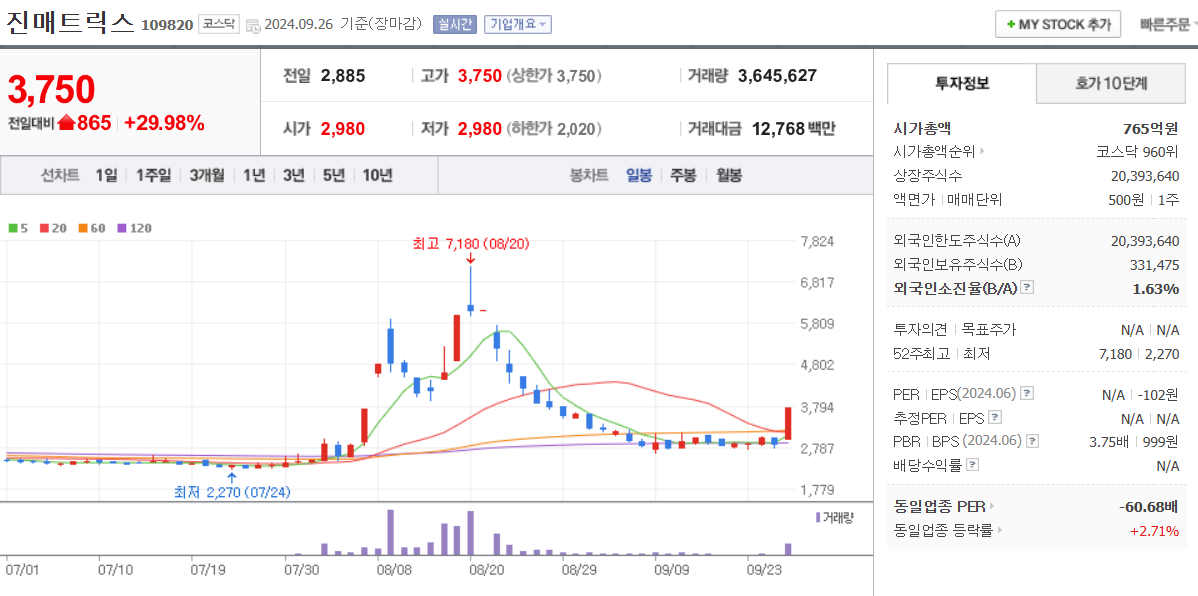 진매트릭스(상한가) - 대상포진 백신 후보물질 유효성 연구 게재 이슈