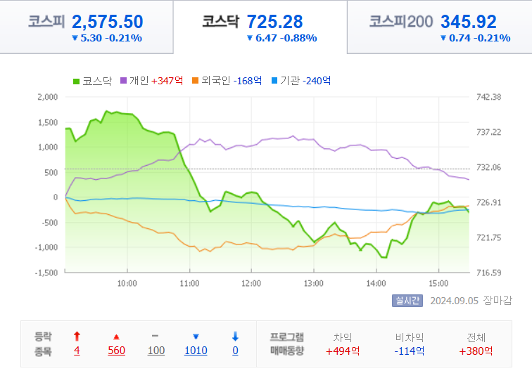 하락 마감을 했습니다. 코스피 지수는 전날보다 5.30(0.21%) 하락한 2575.50으로 장을 마쳤습니다.