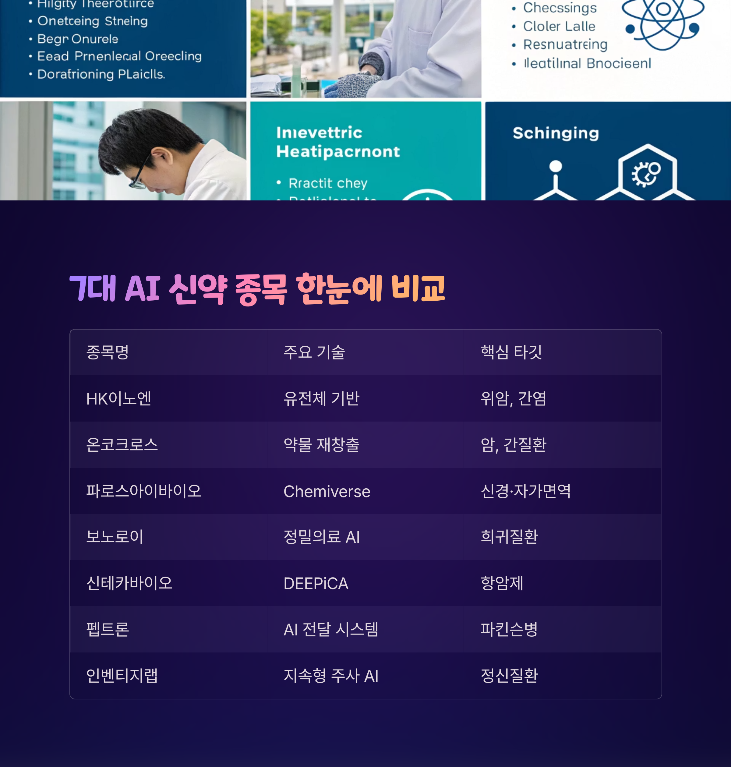 | HK이노엔 | 유전체 기반 신약 | 위암, 간염 | 기존 매출 + AI 전환 |