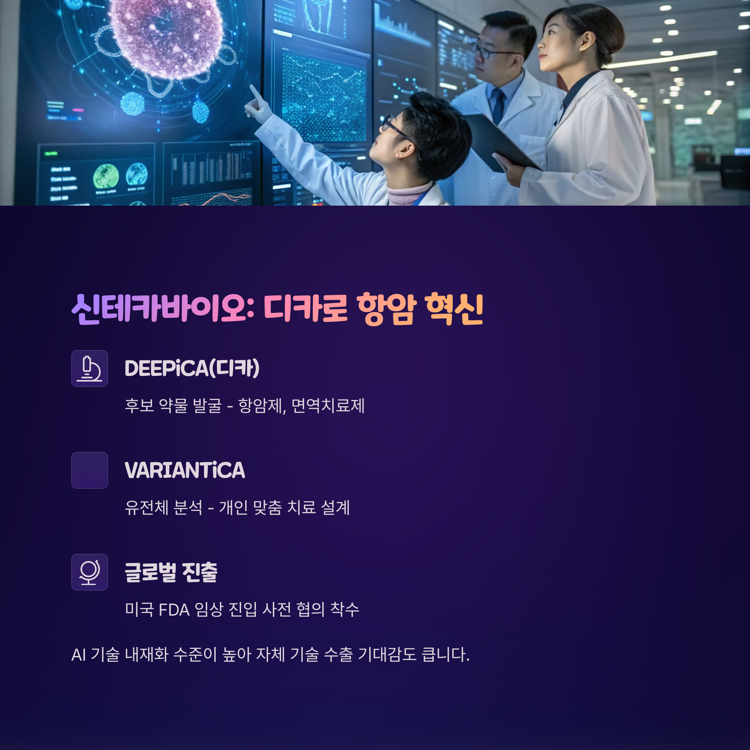 | 신테카바이오 | DEEPiCA 플랫폼 | 항암제 | 기술 수출 기대 |