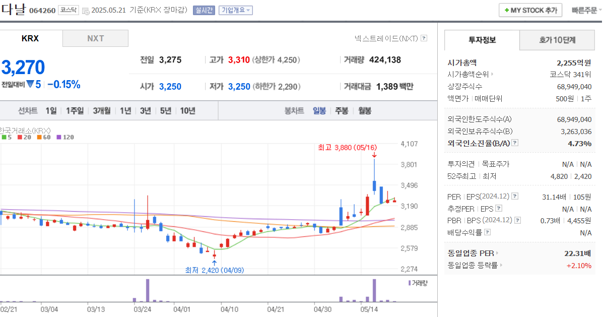다날을 제외하고는 크게 움직이지 않았습니다.다날은 넥스트시장에서 크게 움직였습니다.그리고 시간외 에서는
