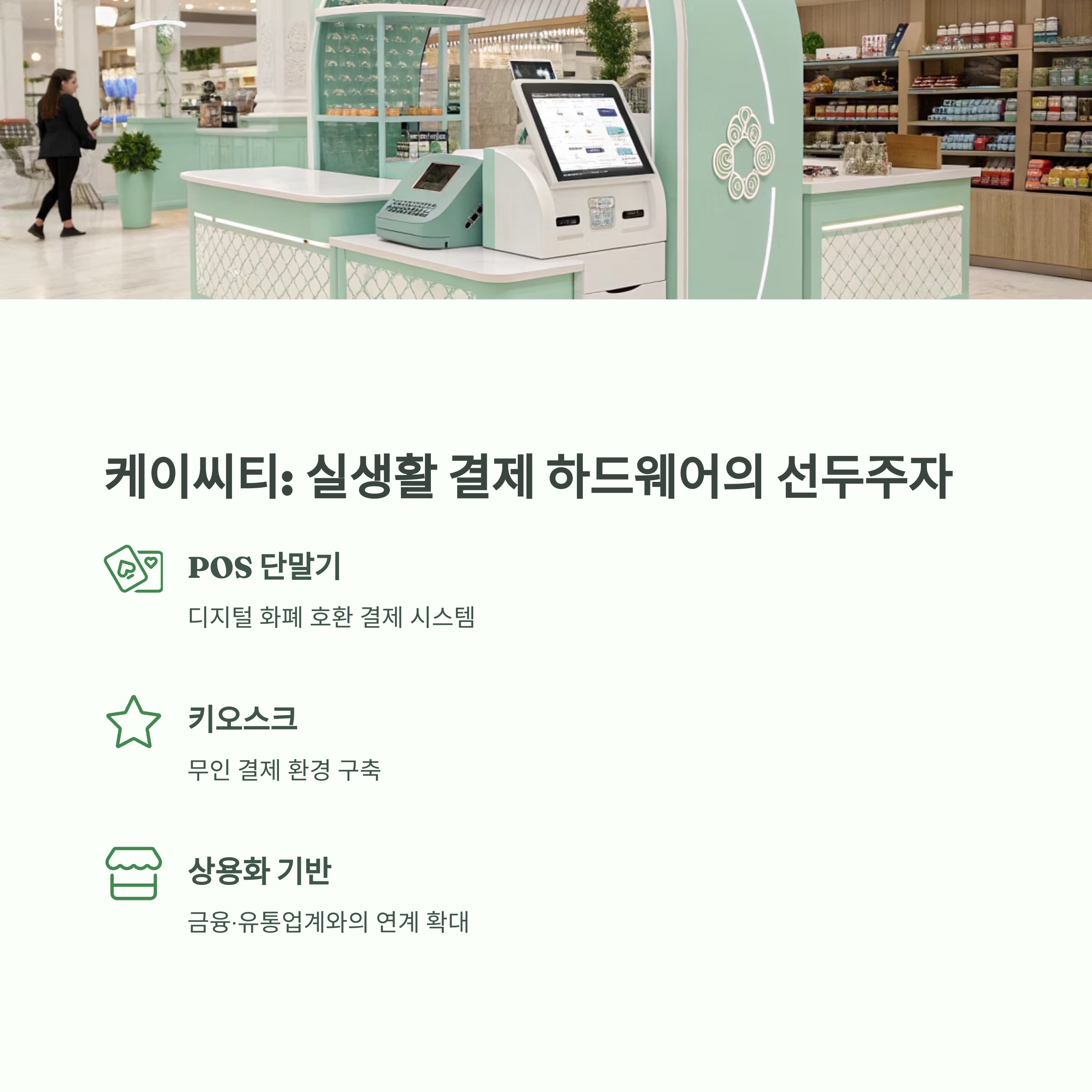 | 케이씨티 | 키오스크, POS 제조 | 실생활 결제 인프라 제공 |