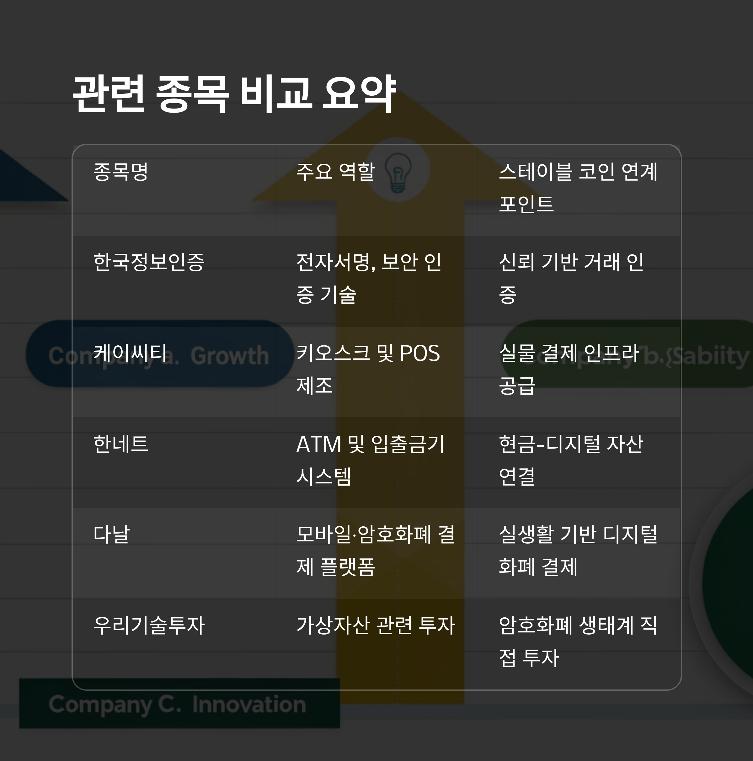 | 종목명 | 주요 역할 | 스테이블 코인 연계 포인트 |
