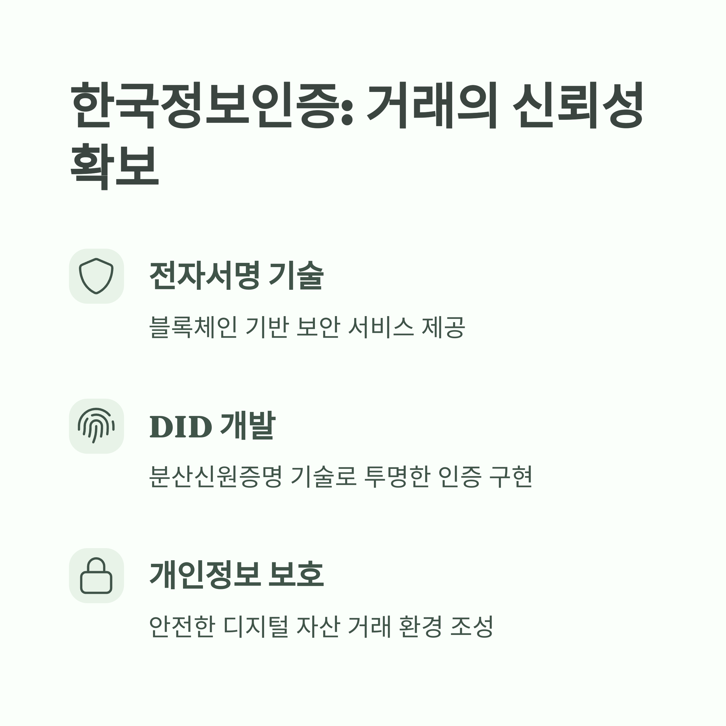 | 한국정보인증 | 전자서명, DID 기술 보유 | 거래 신뢰성 확보 및 블록체인 인증 |