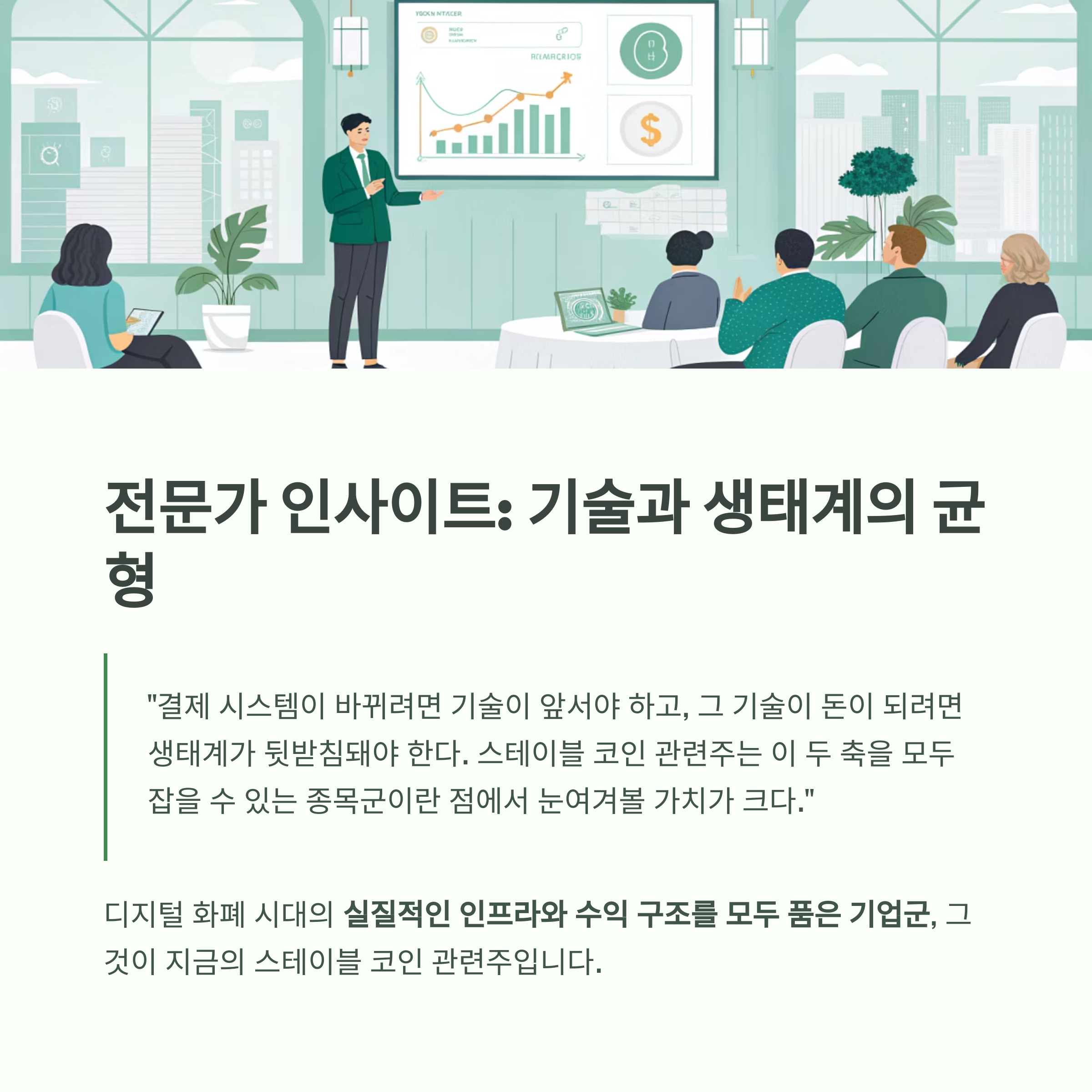 "스테이블 코인이 실생활 결제 수단으로 정착하려면, 기술보다 먼저 인프라가 준비되어야 한다. 그 인프라를 구축하고 있는 기업들을 지금부터 눈여겨보는 것이 필요하다."