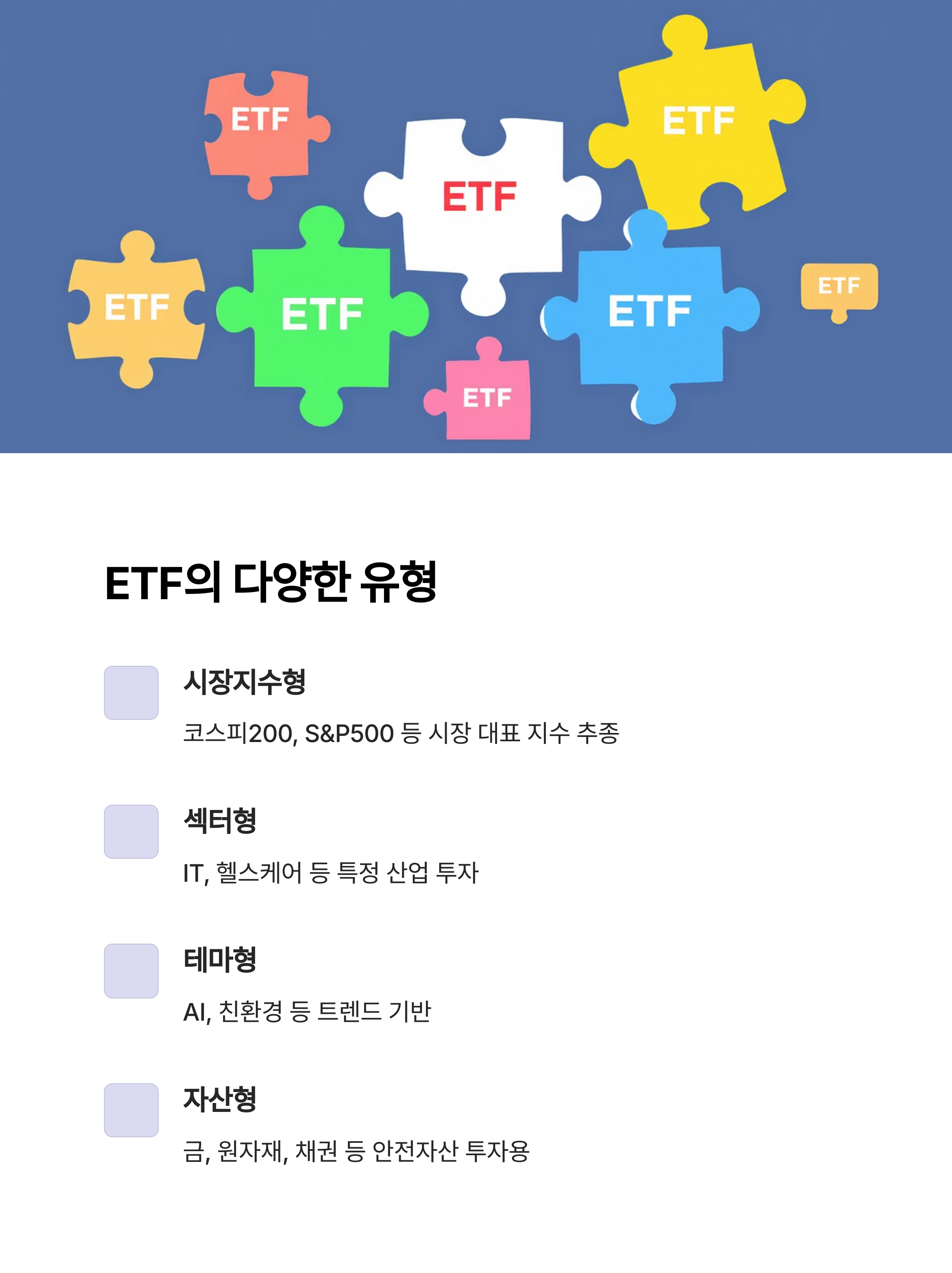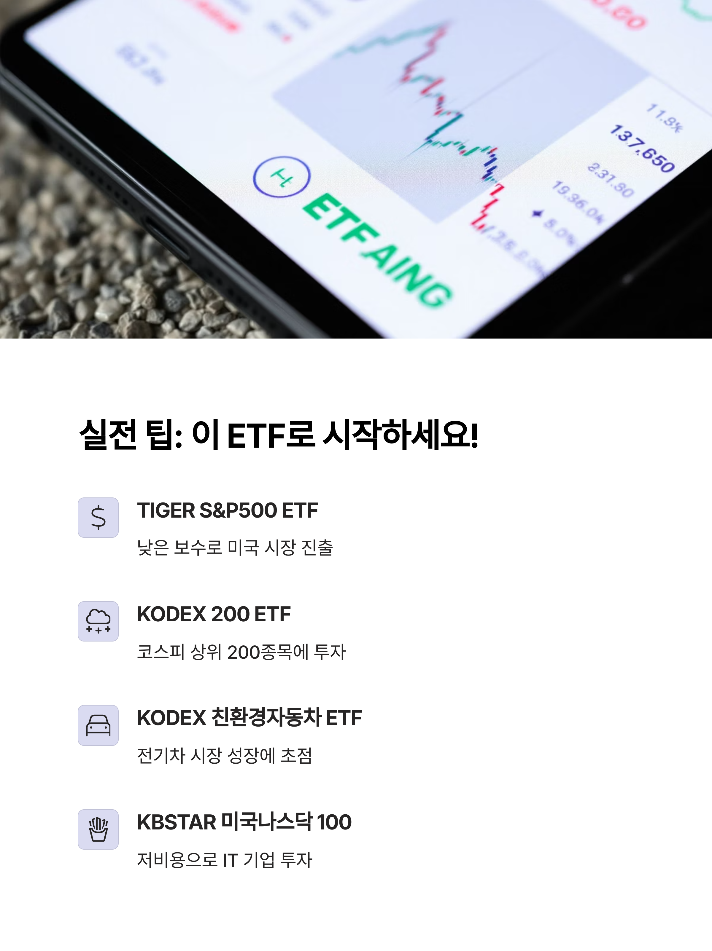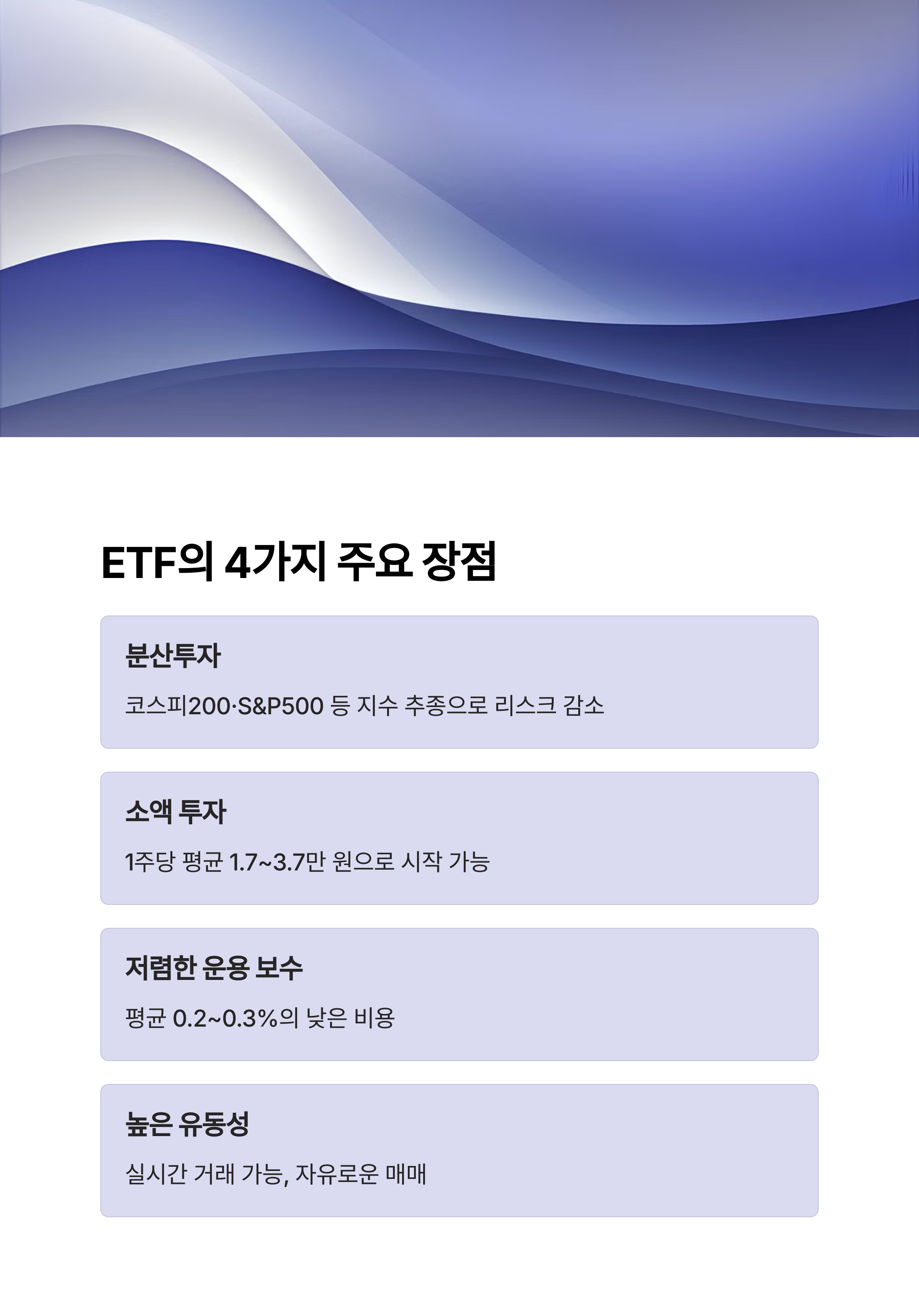 - 5. 분산 투자 구조 – ETF 자체가 포트폴리오로 구성되어 있어 리스크 분산